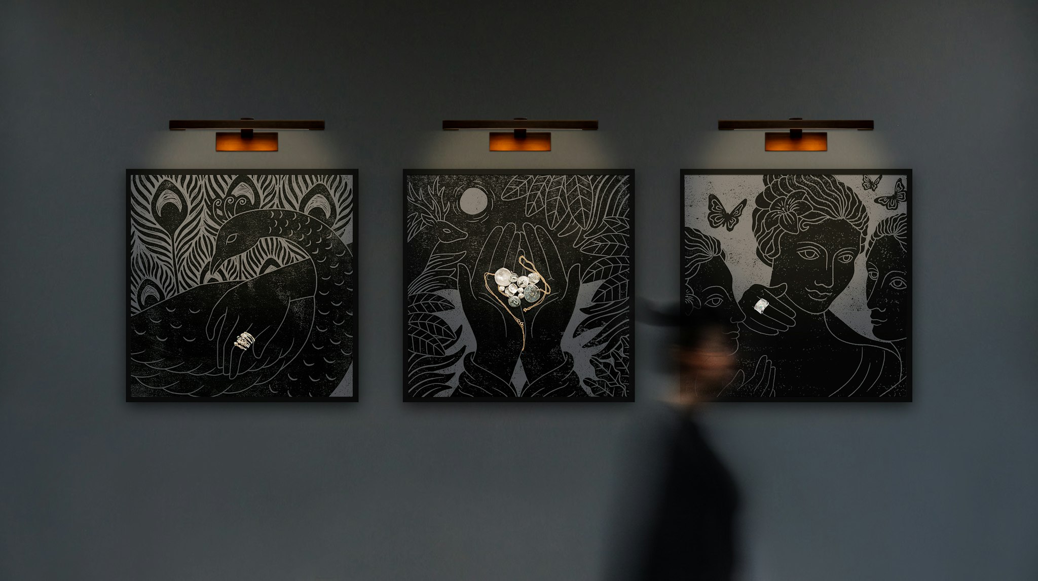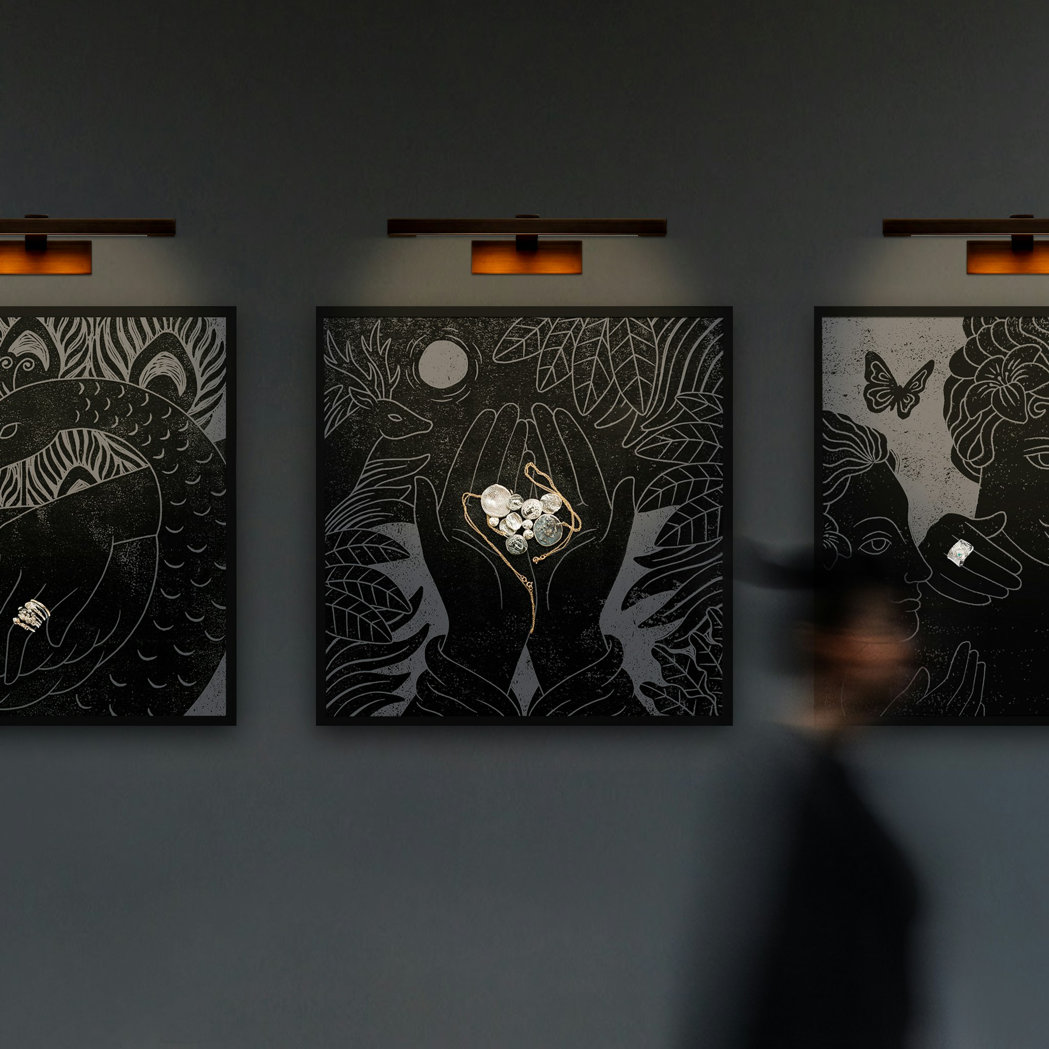 We used an illustrative style to bring the brand’s mythological narrative to life, adding depth and storytelling to the visual identity. The illustrations create a rich, emotive backdrop that elevates each piece of jewellery both visually and figuratively into something symbolic and rooted in meaning. Ironically, this abstract backdrop proved far more powerful than real people… the viewer connects to the different pieces and projects their own emotions and imagination far more easily in this setting, forming an immediate ‘relationship’ with the jewellery.