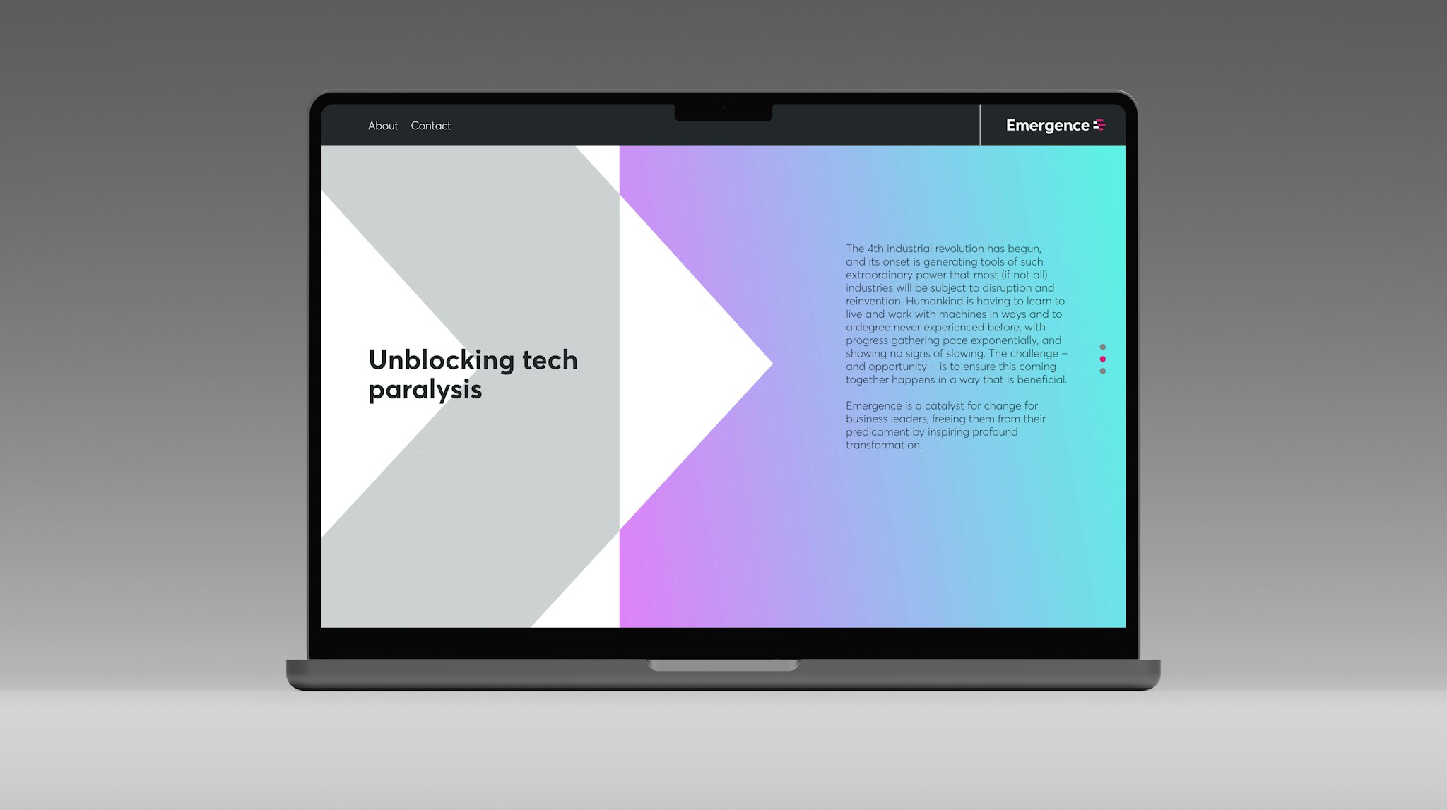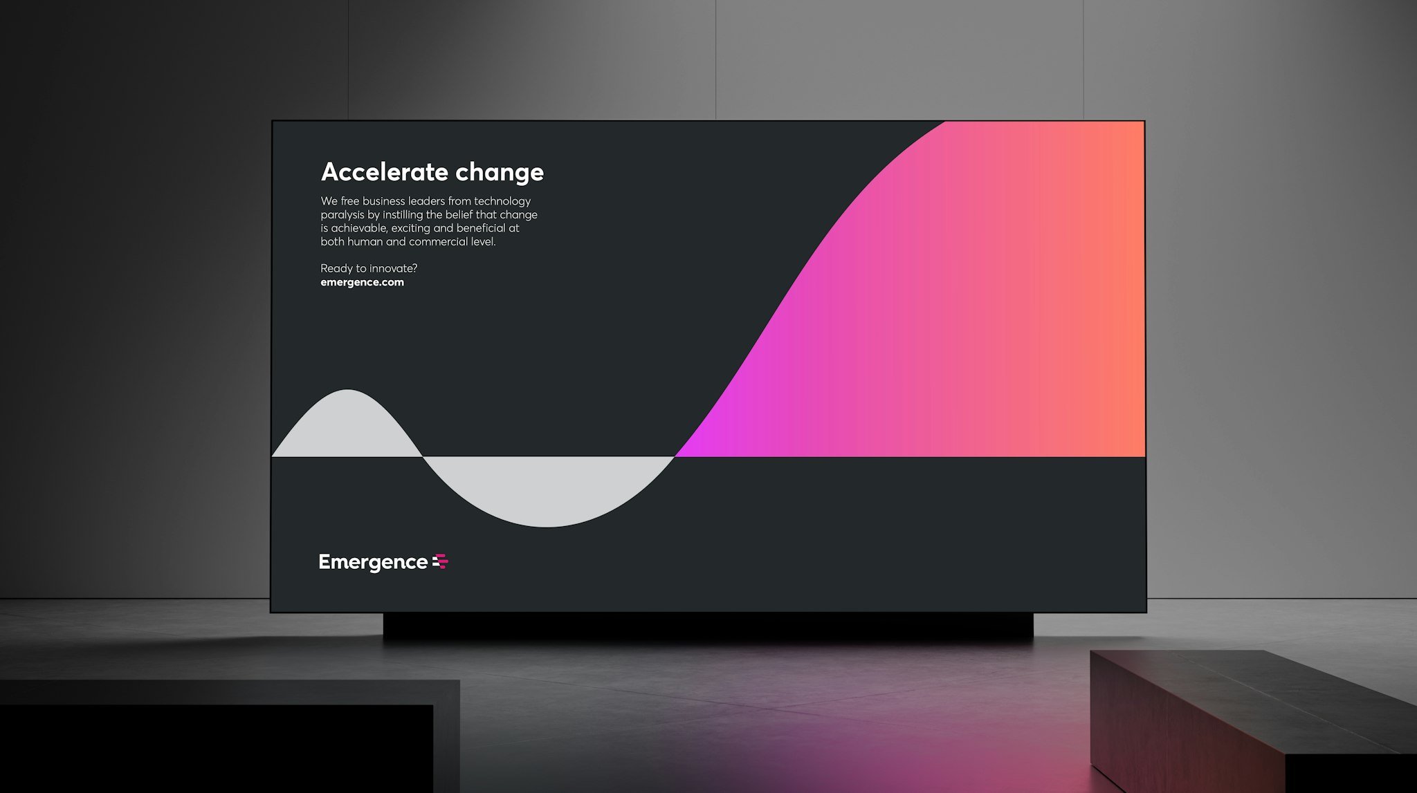 Transformation was at the heart of the visual identity – but approached with imagination, avoiding the clichés that often evoke fear around advanced technology. The identity needed to feel premium, yet infused with energy and optimism – striking the right balance between authority and freshness. Designed to be scalable and adaptable, the brand can evolve over time. Its bold, ever-shifting graphic language features shapes that contort, overlap, and transition between states. Colour is used purposefully, illuminating pathways and insights to reflect Emergence’s role in guiding meaningful transformation.